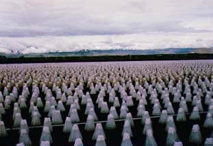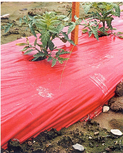 In our 1997 trials, we were shocked at the amount of weed growth under the red plastic. The mulch showed virtually no weed suppression and yields were correspondingly low. The product has been modified to better suppress weeds. Consider using SRM mulch over another mulch such as straw, sawdust or even black plastic. The other mulch may control weeds while the red may increase your yields. At this point we consider it best to view this product as experimental and use it accordingly. One mil HDPE embossed plastic film.