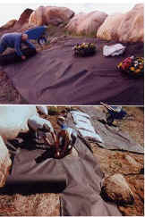 Directions: It's easy to use! Weed wack the area you with to replant. Roll out the Planters Landscape Paper, overlapping the edges 3". Keep in place with stakes were necessary. With a knife or scissors, cut around rocks, trees, shrubs and to any size and shape necessary. Cut slits plantings and plant right through the paper, or gently work existing small plants up through the slits. Broadcast mulch 3" deep and irrigate as normal. This is a great way to cut costs on chemicals, time and money.